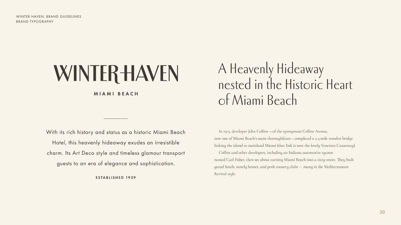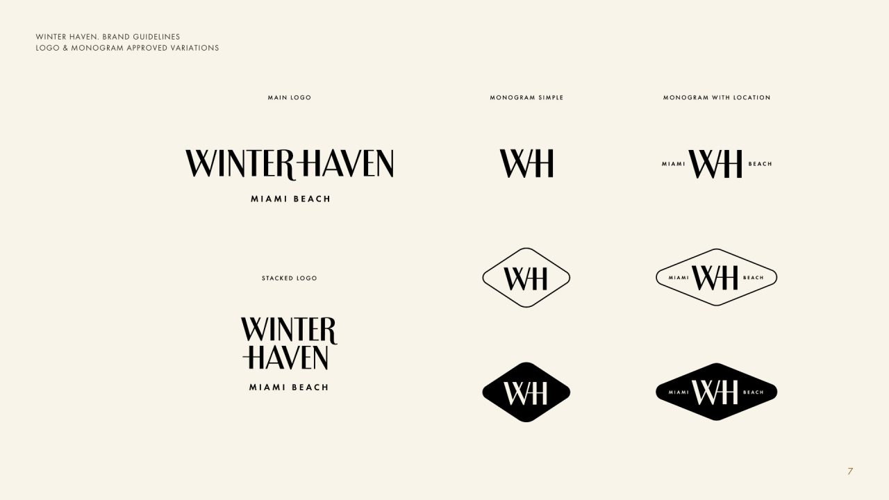 Winter Haven identity was inspired by the classic imagery of leisure destinations of the 50s—lighthearted, idyllic and elegant— and by the iconic, oceanfront location on sunny Miami Beach.